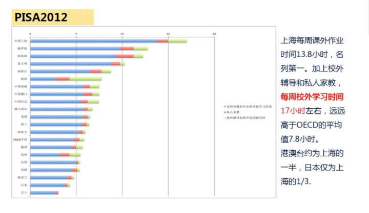 以2012年PISA测试的学生课外作业时间调查为例可以说明很多问题。中国不仅获得了学业成就的第一,还获得了课业负担第一,学习时间之长,是世界之最。这说的世界之最完全是真实的,高于OECD国家其他的平均值7.8个小时,港澳和其他地区课外学习时间是上海的一半,而日本仅为上海的1/3。这个排行最后的一位是日本,而上海是第一位,可以看到这个差距之大。