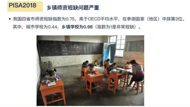 2018年的调查还有一个重要的数据,就是上海、北京、浙江、江苏的四省联队师资短缺情况比较严重,高于OECD国家的平均水平,尤其是乡镇学校短缺非常严重,是非常短缺的状态。关键是我们要看到,北京、上海、江苏、浙江还是中国经济最发达,教育文化最发达的省份,如果考虑到广大的中西部地区,师资短缺这个情况更为严重。