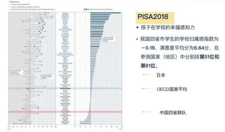 PISA还测量了孩子的主观感受,就是学生在学校的幸福感知。从2018年调查来看,中国的学生幸福感知也是排在了最后的序列,排到了第51位和第61位。