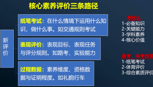 三条路径超越知识点的测评,超越双向细目表,纸笔考试也要变,重视表现评价。过程性评价并不复杂,尤其是随着5G、云技术的发展,学习过程可以通过电子数据做综合性评价。高中生综合性素质评价——“两依据,一参考”。两依据,就是“3+3”。本来是参考综合素质的,为什么参考不起来?因为现在的综合素质数据评价是人为的,不可比,不靠谱。但设想未来,如果一名高中生的学习数据很丰富,用电子记录,用设备仪器采集数据,将来会还需要考试吗?这就是关于未来综合素质核心素养的评价。