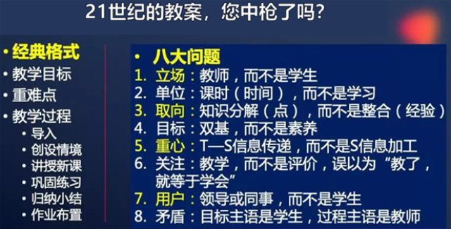这些环节的主语都是老师。老师写教案目的会写培养学生什么,激发学生什么,让学生学会什么,但老师不知道真正的教学目的,因为目的太高大上,跟内容没多大的直接关系。新课标要求大家写目标,目标是学生到哪里去,学习的目的是什么,回答重难点是什么?通过什么过程方法来解决重点,把重难点解决到什么程度。如果你已经写了目标,还要再写重难点,说明你根本不知道什么叫目标,你本来是清楚的,又把它搞糊涂了。现在的教学过程的主语都是写老师自己做什么。可问题是,你自己到课堂里做什么你自己还不知道吗?还要写出来?医生写处方写病例,从来不写自己做什么,都写病人做什么。医生都是以患者为中心,会告诉病人要吃什么药,做什么检查。那老师的教学方案能不能设计成和学生学习相关的东西?所以要把教案先变掉,教案都没变,还指望课堂能变吗?现在的教学,主次都搞乱了。很多老师抱怨,整天忙得要死,学生也整天忙,但碌碌无为,学生也没有素养。20多年过去了,到了21世纪,可我们还在做20世纪的教案。