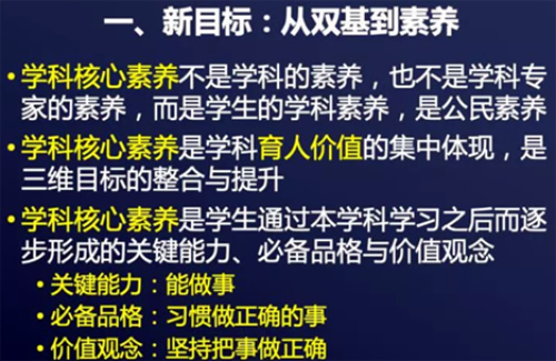 新课程,新教学,主要依据是新目标。学科核心素养是指公民素养,不是指学科专家的素养。它包括三个方面:第一,关键能力,即能做事;第二,必备品格,即习惯做正确的事;第三,价值观念,即坚持把事做正确。如生物学科的四大核心素养是:生命观念、科学探究、科学思维、社会责任。