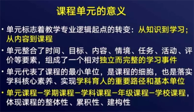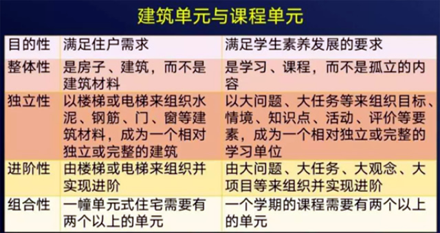 第二,现在的单元,有统示中心 。大观念、大问题、大项目、大任务,每个单元,必须有建构。统一整合到一起。