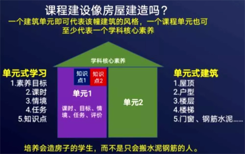 知识点是建筑材料,而单元是房子。可现在的问题是,教学生整天搬钢筋水泥,不教他造房子,这就是素养和知识点的关系问题。我们教了一批学生,都会搬钢筋水泥,搬了一大堆水泥,但房子造3层还是5层都不知道。