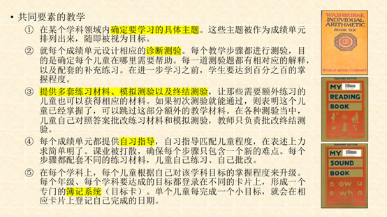 一是共同要素的教学。华虚朋指出,“如果某些知识或技能对几乎每个普通人都有必要,那么、应该让每个儿童都真正掌握”,并且“有必要为不同儿童提供不同长度的时间和数量的个别化材料”。