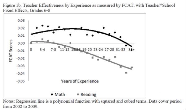 我们可以看到,以FCAT成绩为衡量标准,数学教师的效能在教学时长达到12年左右达到峰值,然后开始缓慢降低,而从20年左右开始急剧降低,而到33-34年左右降低到基准值以下。而阅读教师的效能则是从一开始保持2年左右开始缓慢降低,到7-8年左右就降到基准线以下。