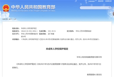 • 为贯彻落实新修订的未成年人保护法,在广泛调研、公开征求意见基础上,教育部部长陈宝生于6月1日签发第50号教育部令,颁布《未成年人学校保护规定》(以下简称《规定》)。《规定》落实未成年人保护法中关于“学校保护”的规定,系统整合、创新完善了学校未成年人保护制度,分一般保护、专项保护、管理要求和保护机制等章节,全面构建了学校保护制度体系,就社会.........