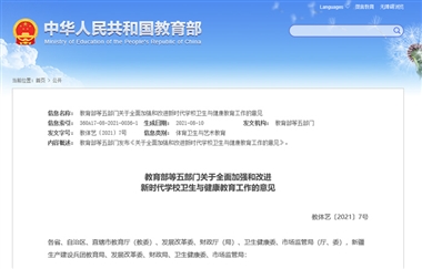 • 各省、自治区、直辖市教育厅(教委)、发展改革委、财政厅(局)、卫生健康委、市场监管局(厅、委),新疆生产建设兵团教育局、发展改革委、财政局、卫生健康委、市场监管局:加强新时代学校和幼儿园(以下统称学校)卫生与健康教育工作,是全面推进健康中国建设的重要基础,是加快推进教育现代化、建设高质量教育体系和建成教育强国的重要任务,是大力发展素质教育.........