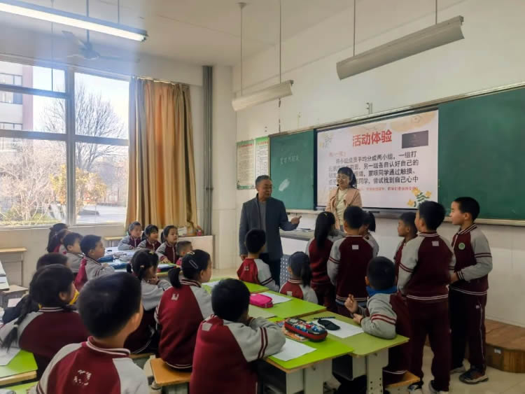 班会开展过程中,成浩教授针对《蒙眼找朋友》体验活动环节现场给予了指导,以点到面,找两个小组做了示范,让同学们能看到其他小组是怎样找朋友的,让学生说一说你是根据什么特点找到朋友的,同时给予激励性的评价语言,还找其他小组的小记者进行了采访,体验活动育人效果凸显。