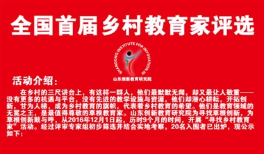 • 在乡村的三尺讲台上,有这样一群人,他们最默默无闻,却又最让人敬重——没有更多的机遇与平台,没有先进的教学设施与资源,他们却潜心耕耘,开拓创新,甘为人梯,成为乡村教育的旗帜,代表着乡村教育的希望。他们是教育领域的无冕之王,是最值得尊敬的草根教育家。山东创新教育研究院为寻找草根创新,为草根创新鼓与呼,从2016年12月1日起,历时9个月的时间.........