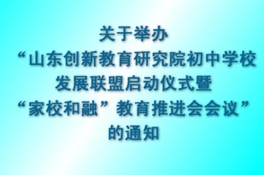 • 关于举办“山东创新教育研究院初中学校发展联盟启动仪式暨“家校和融”教育推进会会议”的通知各市地(县、市、区)教育局,各市地教科院(教研室),山东创新教育研究院各成员单位,各中小学:在这个教育发生着深刻变革的时代,在这个竞争与合作的时代,家校合作正成为时代与现实的强烈呼唤,成为学校教育改革的重要切口。一些走在改革前沿的学校开始在家校合作领域.........
