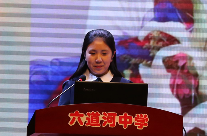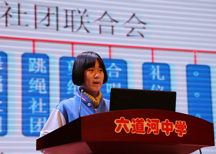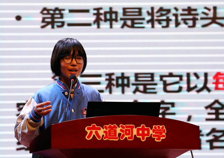 在六道河中学中,学生们自主开展了六中百家讲坛活动。在这次会议上九年六班的马海媛展示的是《藏头诗》第一讲,她借吴用的“芦”“俊”“义”“反”诠释了藏头诗的涵义深、品位高、价值重,并介绍了藏头诗表现的三种形式,最后以自己小诗一首里的“勤”“奋”“学”“习”表明了主张培养学生们热爱学习、快乐学习的好习惯。第二讲是来自九年六班的杨文爽同学关于对古代清朝皇帝用膳的讲解,她从用膳的时间、具体流程、菜品种类等几个方面展开阐述,使与会的专家、老师们不仅了解到了中国文化的博大精深,也感受到了六中学子们的风采。