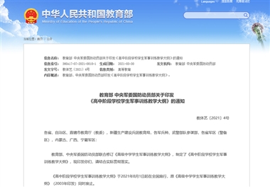 • 为全面贯彻党的教育方针,落实立德树人根本任务和强军目标根本要求,全面规范高中阶段学校学生军事训练组织与实施,加强国防后备力量建设,培养德智体美劳全面发展的社会主义建设者和接班人,根据《中华人民共和国国防法》《中华人民共和国教育法》和《中华人民共和国国防教育法》,以及国务院办公厅、中央军委办公厅关于深化学生军事训练改革的有关文件精神,制定本.........
