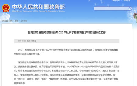 • 近日,教育部印发《关于做好2020年秋季学期教育教学和疫情防控工作的通知》,统筹做好秋季学期教育教学和新冠肺炎疫情防控工作。  通知要求全面恢复教育教学秩序。各地各校要充分认识恢复正常教育教学秩序对经济社会发展大局的重大意义,按照国家卫生健康委、教育部联合印发的高等学校、中小学校和托幼机构秋冬季新冠肺炎疫情防控技术方案要求,结合本地疫情防.........
