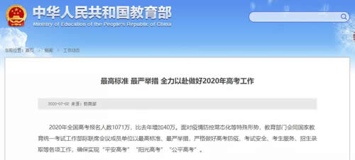 • 2020年全国高考报名人数1071万,比去年增加40万。面对疫情防控常态化等特殊形势,教育部门会同国家教育统一考试工作部际联席会议成员单位以最高标准、最严举措,严格做好高考防疫、考试安全、考生服务、招生录取等各项工作,确保实现“平安高考”“阳光高考”“公平高考”。一、以最严格的措施,加强考试防疫。教育部会同国家卫生健康委指导各地结合实际,.........