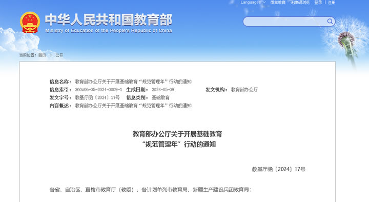 • 教育部办公厅关于开展基础教育“规范管理年”行动的通知教基厅函〔2024〕17号各省、自治区、直辖市教育厅(教委),各计划单列市教育局,新疆生产建设兵团教育局:  为全面贯彻党的教育方针,进一步依法依规加强中小学幼儿园办学行为管理,提升基础教育治理水平,提高人民群众教育满意度,教育部决定组织开展基础教育“规范管理年”行动(以下简称“规范管理.........
