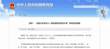 • 日前,教育部官网发布“全国大学生同上一堂疫情防控思政大课”即将在线直播预告。3月9日14:30至16:00,教育部社科司与人民网联合组织“全国大学生同上一堂疫情防控思政大课”。磨难压不垮、奋起正当时。在举国上下万众一心、众志成城做好新冠肺炎疫情防控工作的特殊时刻,我们不能亲临主战场,但我们能坚持在大战中坚定信心、不负韶华。为将高校思想政治.........
