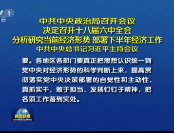 •   新华社北京7月26日电 中共中央政治局7月26日召开会议,决定今年10月在北京召开中国共产党第十八届中央委员会第六次全体会议,主要议程是,中共中央政治局向中央委员会报告工作,研究全面从严治党重大问题,制定新形势下党内政治生活若干准则,修订《中国共产党党内监督条例(试行)》。会议分析研究当前经济形势,部署下半年经济工作。中共中央总书记习.........