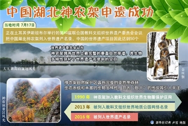 • 正在土耳其伊斯坦布尔举行的第40届联合国教科文组织世界遗产委员会会议(世界遗产大会)17日把中国湖北神农架列入世界遗产名录,中国的世界遗产项目因此达到50个。  有关神农架的评估报告指出,湖北神农架被视为野生动植物的“宝库”,尤以丰富的植物多样性闻名。大会引述报告内容说:“神农架在植物研究史上占据重要位置,科学家尤其是植物学家一直对神农架.........