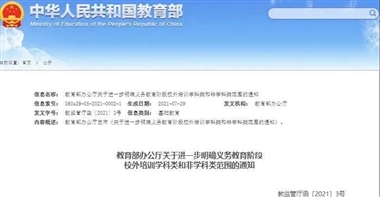 • 教育部办公厅关于进一步明确义务教育阶段校外培训学科类和非学科类范围的通知 教监管厅函〔2021〕3号各省、自治区、直辖市教育厅(教委),新疆生产建设兵团教育局:  为贯彻落实中共中央办公厅、国务院办公厅印发的《关于进一步减轻义务教育阶段学生作业负担和校外培训负担的意见》,指导各地做好校外培训(包括线上培训和线下培训)治理工作,现.........